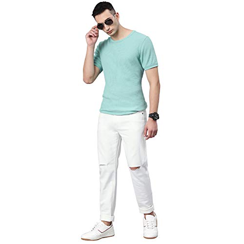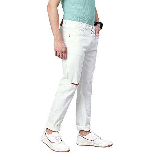 Slim Fit; Mid-Rise; Regular Length; Zip Fly with Buttoned Closure; Solid Style ; Knee Slit/Slash Pattern; Perfect for Casual, Party Wear