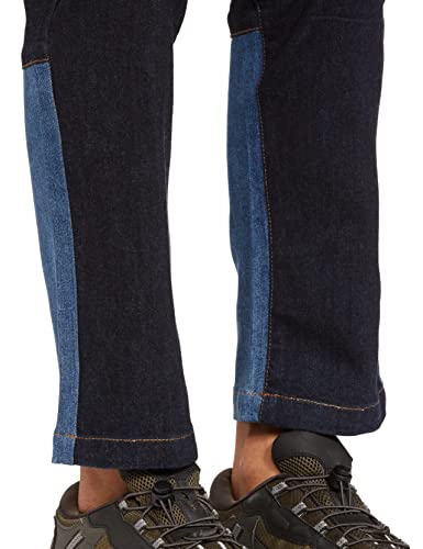 Jeans with colour blocking cut sew panel at back hem and rivets over pockets. It has bar tacks on belt loops and on top stich at side seam