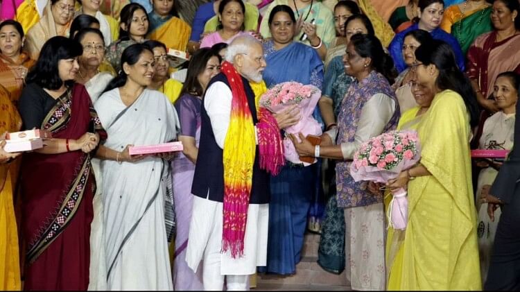 राज्यसभा में बिल पास होने के बाद पीएम मोदी ने महिला सांसदों के साथ फोटो खिंचवाई। इस दौरान पीएम मोदी ने महिला सांसदों को मिठाई बांटी। महिला सांसदों ने पीएम मोदी को पुष्प गुच्छ देकर ऐतिहासिक बिल के लिए उन्हें धन्यवाद कहा।