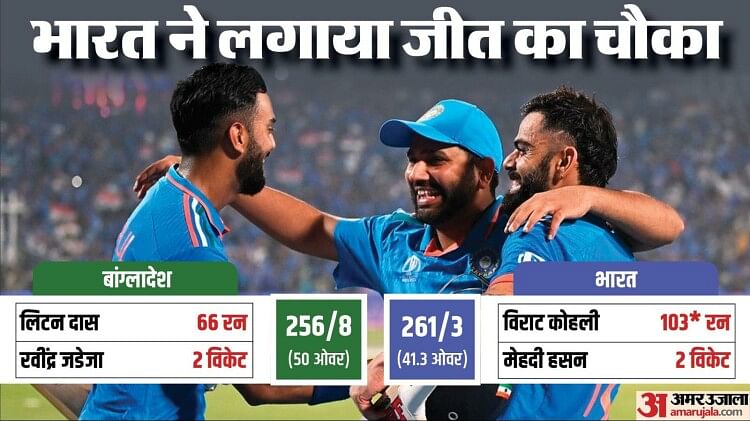 वनडे विश्व कप 2023 में भारत ने लगातार चौथे मैच में जीत हासिल की है। पुणे के मैदान में टीम इंडिया ने बांग्लादेश को सात विकेट से हराया। बांग्लादेश ने पहले बल्लेबाजी करते हुए आठ विकेट खोकर 256 रन बनाए थे। इसके जवाब में टीम इंडिया ने 41.3 ओवर में तीन विकेट खोकर 261 रन बना लिए और मैच अपने नाम किया। भारत के लिए विराट कोहली ने नाबाद 103 रन बनाए। शुभमन गिल ने भी 53 रन की शानदार पारी खेली। रोहित शर्मा ने 48 रन बनाए। गेंदबाजी में रवींद्र जडेजा, जसप्रीत बुमराह और मोहम्मद सिराज ने दो-दो विकेट लिए।