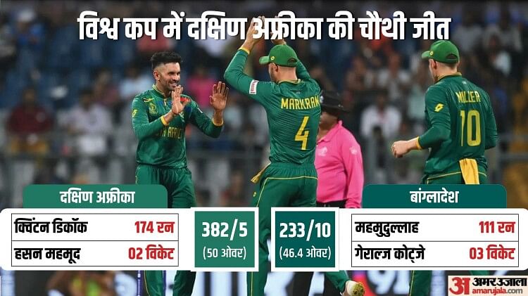 दक्षिण अफ्रीका ने टॉस जीतकर पहले बल्लेबाजी करते हुए निर्धारित 50 ओवर में पांच विकेट खोकर 382 रन बनाए थे। इसके जवाब में बांग्लादेश की टीम 46.4 ओवर में 233 रन ही बना पाई और मैच 149 रन से हार गई। बांग्लादेश के लिए महमुदुल्लाह रियाद ने 111 रन बनाए, लेकिन उनकी पारी टीम के काम नहीं आ सकी। दक्षिण अफ्रीका के लिए क्विंटन डिकॉक ने 174 और हेनरिक क्लासेन ने 90 रन बनाए। कप्तान मार्करम ने 60 रन का योगदान दिया।