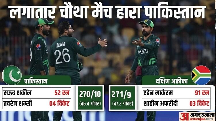 वनडे विश्व कप 2023 के 26वें मैच में पाकिस्तान को दक्षिण अफ्रीका के खिलाफ हार का सामना करना पड़ा। यह इस टूर्नामेंट का अब तक का सबसे रोमांचक मुकाबला रहा और अंत में दक्षिण अफ्रीका ने एक विकेट से जीत हासिल की। लगातार चौथे मैच में हार के साथ पाकिस्तान की टीम सेमीफाइनल की रेस से लगभग बाहर हो चुकी है। वहीं, दक्षिण अफ्रीका की टीम पांचवीं जीत के साथ अंक तालिका में शीर्ष पर आ गई है।