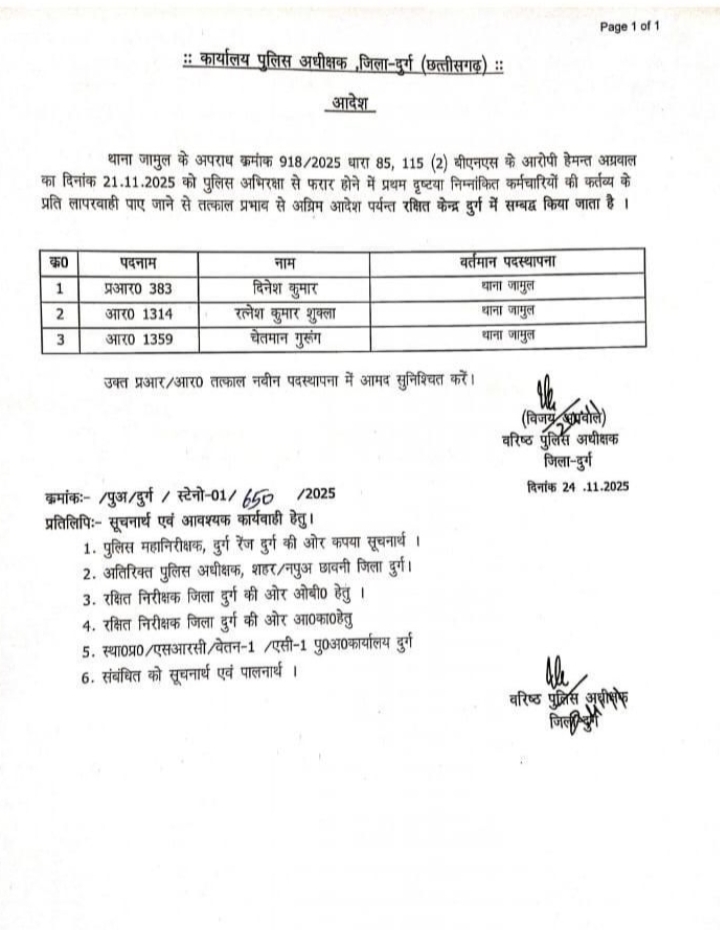 BREAKING:- वरिष्ठ पुलिस अधीक्षक विजय अग्रवाल ने पुलिस अभिरक्षा में आरोपी के फरार होने के मामले में जामुल थाना में तैनात प्रधान आरक्षक एवं दो आरक्षकों को तत्काल प्रभाव से लाइन नोटिस की जाने के आदेश जारी किए जानकारी के अनुसार थाना जामुल के अपराध क्रमांक 918/2025 धारा 85, 115 (2) बीएनएस के आरोपी हेमन्त अग्रवाल जामुल पुलिस की अभिरक्षा से 21.11.2025 फरार होने में वरिष्ठ पुलिस अधीक्षक विजय अग्रवाल ने प्रथम दृष्टया निम्नांकित कर्मचारियों की कर्तव्य के प्रति लापरवाही पाए जाने से तत्काल प्रभाव से अग्रिम आदेश पर्यन्त रक्षित केन्द्र दुर्ग में सम्बद्ध किया जाता है।