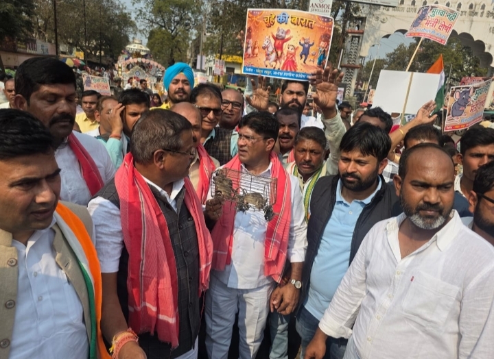 नाचते-गाते चूहे, मंत्रियों की बारात निकाल अधिकारियों को सौंपा गया पिंजरे में चूहा , नारों से गूंजा कलेक्टर कार्यालय