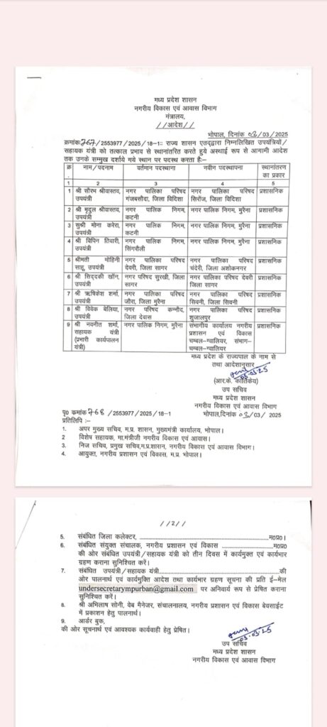 सूत्रों के अनुसार, संचालनालय, भोपाल द्वारा दिनांक 03 मार्च 2025 को नगर निगम कटनी में पदस्थ दो उपयंत्री—मोना करेरा एवं मृदुल श्रीवास्तव का नगर निगम मुरैना ट्रांसफर किया गया था।