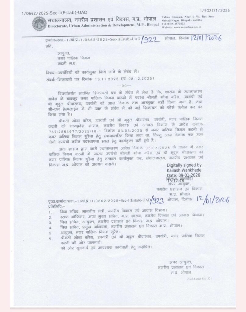 इसके बावजूद, कटनी नगर निगम द्वारा दोनों अधिकारियों को रिलीव नहीं किया गया।